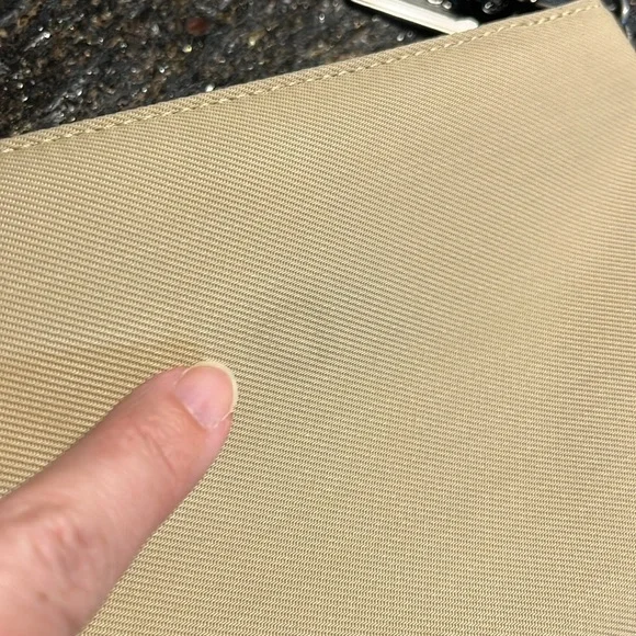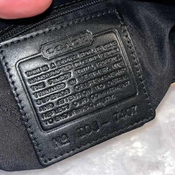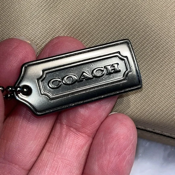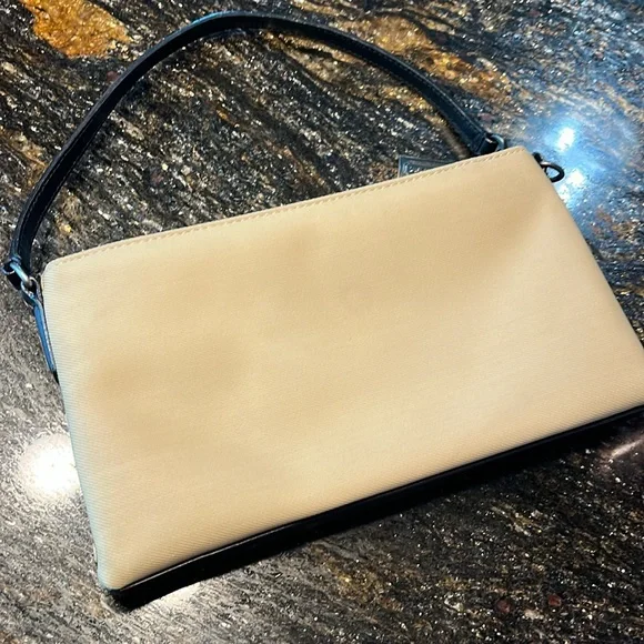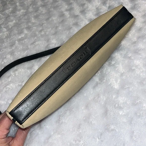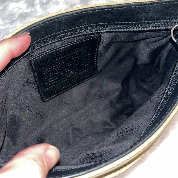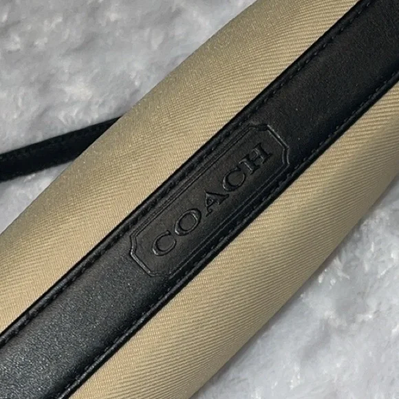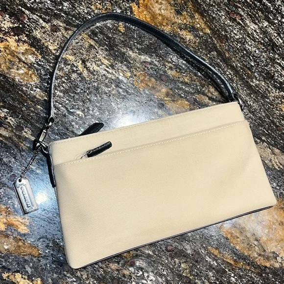 This absolutely fabulous vintage Coach Mercer Demi bag is perfect for any occasion and carrying all the essentials. Its sleek design and neutral color make it a versatile addition to your wardrobe. Easily doubles as a wristlet if desired. The nylon exterior makes it super easy clean. Top zip closure and front zip pocket. Embossed gunmetal hardware and metal Coach hang tag. Leather bottom with Coach embossed and leather shoulder strap (6” strap drop). Style I0J-7417. Only callout is a very light spot on the back of the bag. Very good condition overall. Fantastic find! Don’t miss out!