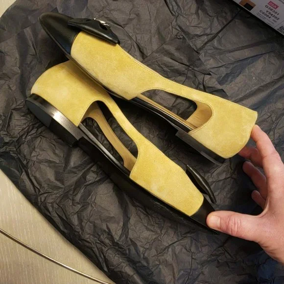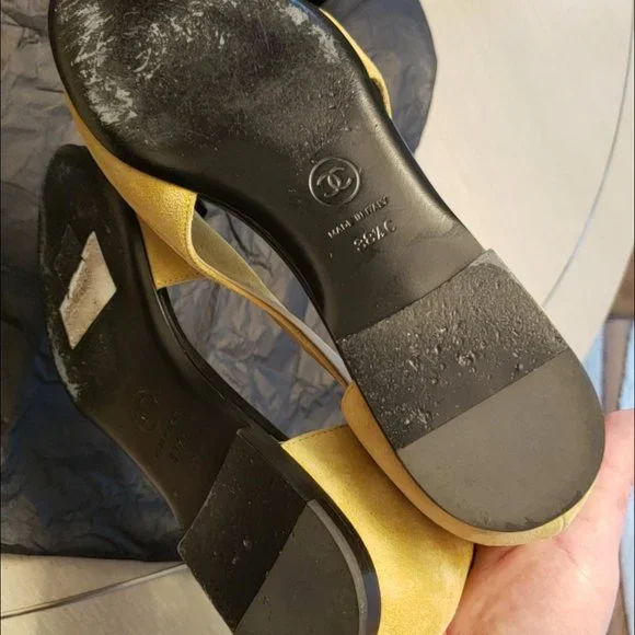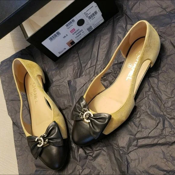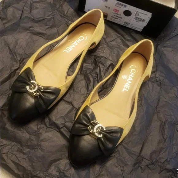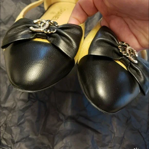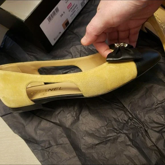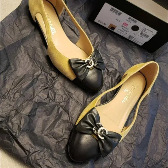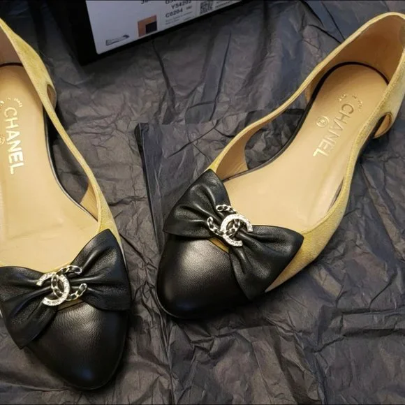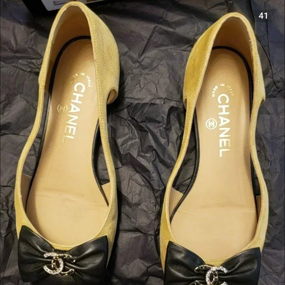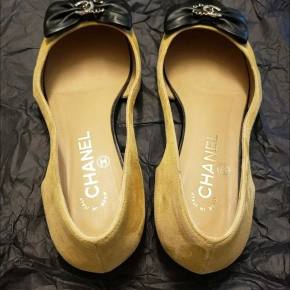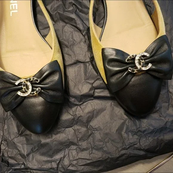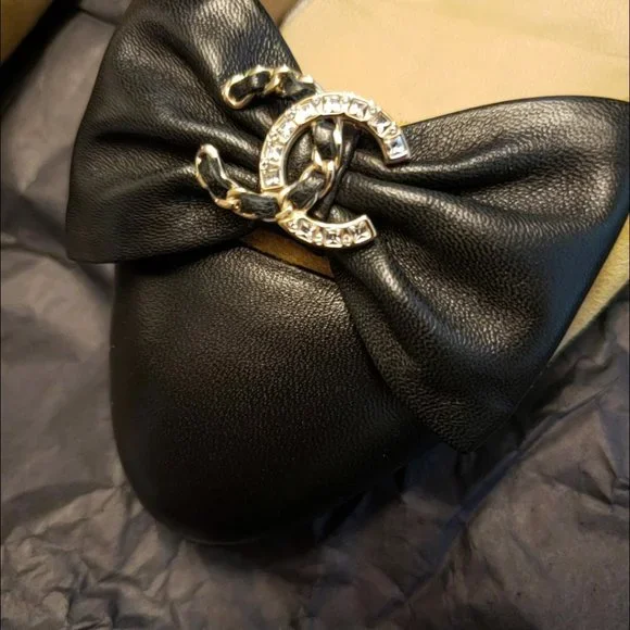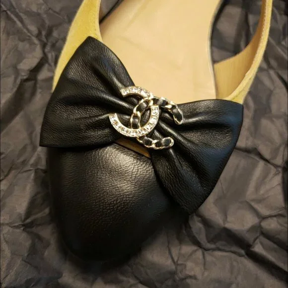 Chanel Crystal Leather and Suede Bow Flats size 38.5CWorn a handful of times.Comes with their Chanel box.Absolutely STUNNING AND GORGEOUS.Beautiful sparkly CC interlocking Bows.Size 38.5C (c means a wider fit for Chanel)Very hard to find! ๐๐๐ see all pics for condition. No return. GORGEOUS! ๐๐๐The ultimate Chanel Flats! Pure Class and Beauty!