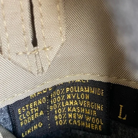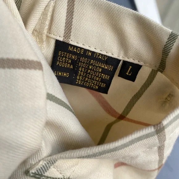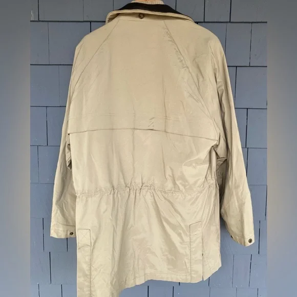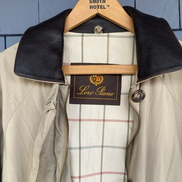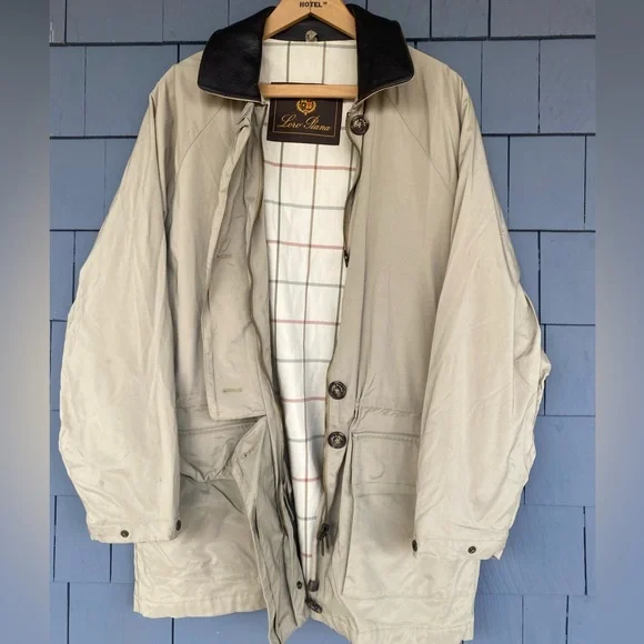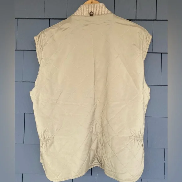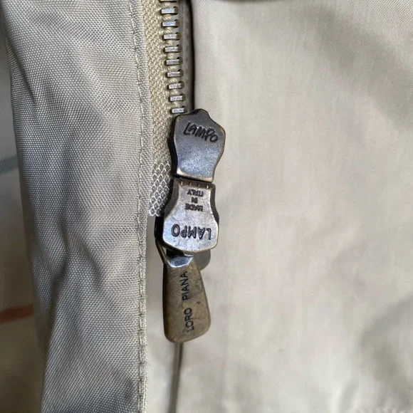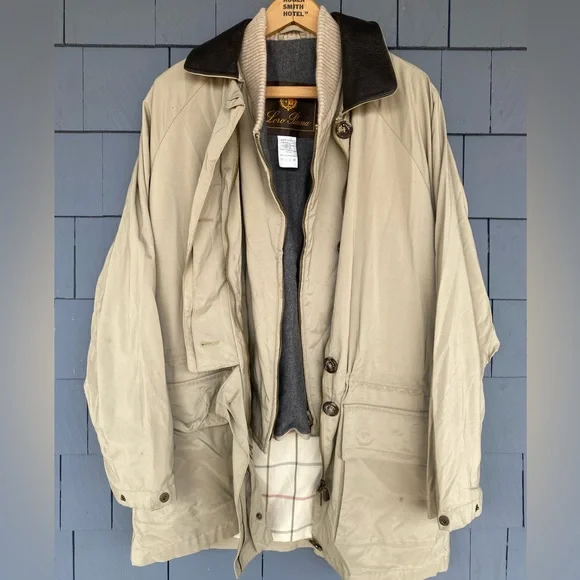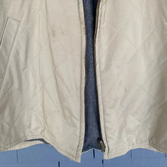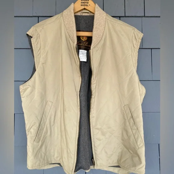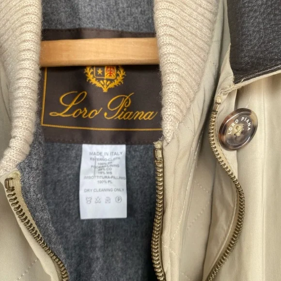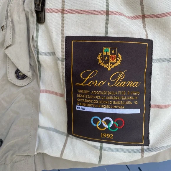 The iconic Loro Piana Horsey Jacket, made in limited numbers to commemorate the 1992 Olympic Games.This particular model is complete the matching quilted vest meant to be worn as an insulting liner.The jacket features a brown leather collar and a lightweight beige nylon exterior with a plaid cotton blend lining, while the vest has a quilted beige exterior and a gray flannel interior made from cashmere and wool.Knit cuffs on the jacket and collar on the vest, lampo zippers and genuine horn buttons throughout.Roomy hip pockets, with multiple smaller inner pockets.In excellent preowned condition, with some marks and wear to the exterior but no holes or other issues.The vest is missing one of its zipper pulls.See photos.Tagged womens size large.