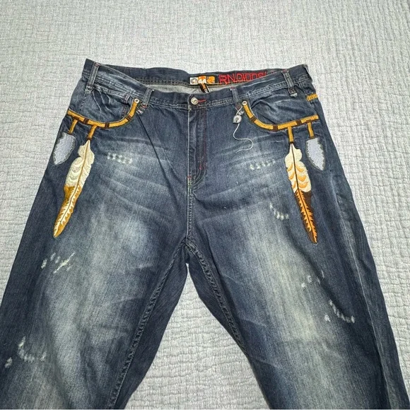 The Akademiks Native Warriors Embroidered Denim Y2K VINTAGE HipHop Baggy Jeans in size 44x34 are a stylish and comfortable pair of jeans with a vintage flair. Featuring intricate embroidered accents and a mid-rise fit, these jeans are perfect for adding a touch of Native American-inspired style to your wardrobe. Made from durable cotton denim fabric, these jeans also offer a practical 5-pocket design and a straight leg style for a classic look. Whether you're into hip hop or just love a retro vibe, these Akademiks jeans are sure to make a statement.