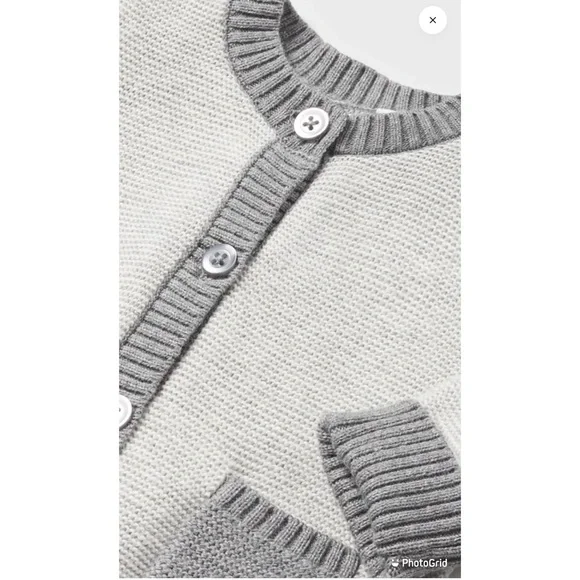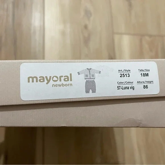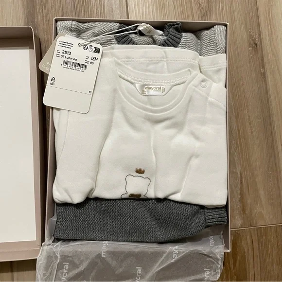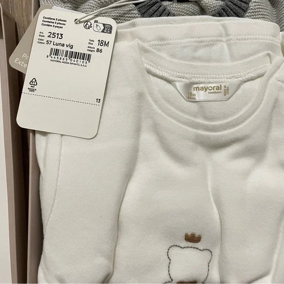 From retailer’s site:Three piece set for newborn. 100% cotton.Cardigan for newborn.T-shirt for newborn. Snap button fastening at the shoulder for easy for easy putting on.Pants for newborn. Garment with stretch leg. This item comes presented in a box from the Newborn collection, ideal to be given as a gift on special occasions. By choosing our cotton products you are supporting our investment in the Better Cotton initiative. Better Cotton is sourced via a chain of custody model called mass balance. This means that Better Cotton is not physically traceable to end products, however, Better Cotton Farmers benefit from the demand for Better Cotton in equivalent volumes to those we source.