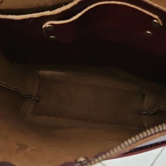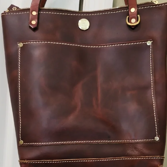 Southlife Supply Co Small Square Tote:Handmade in Thomasville, GAColor: BrickSignature snap closure & zipper closure, 1 interior pocket, 1 exterior pocket, 1 interior key clip,double handle design, full grain cowhide, bridle leather straps, solid brass & brass colored hardware11"h x 9.5" l6" strap drop lengthI own several of their bags and this one doesn't get used like the others I have. Very well made!