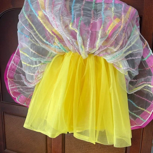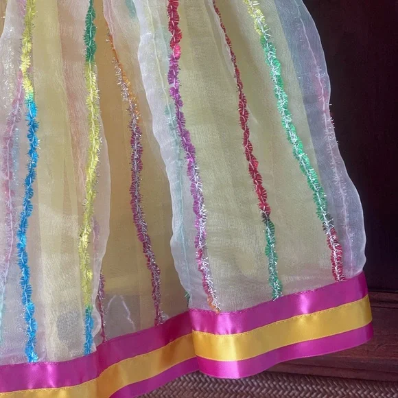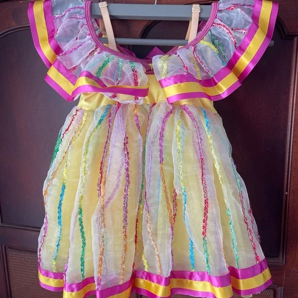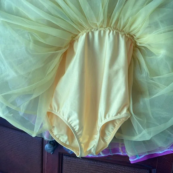 Encanto style.Performance ready! style with nylons.Costume gown.Dress Up Yellow Rainbow Stripe Ensemble.Inside Bodysuit 3T to 4T even a skinny 5.Short style. Ballet Jazz Tap Super stretch bodysuit, dainty short ruffleShould outer with adjustable shoulder straps in tan color.New, never worn. Purchased from ballet company and never used.